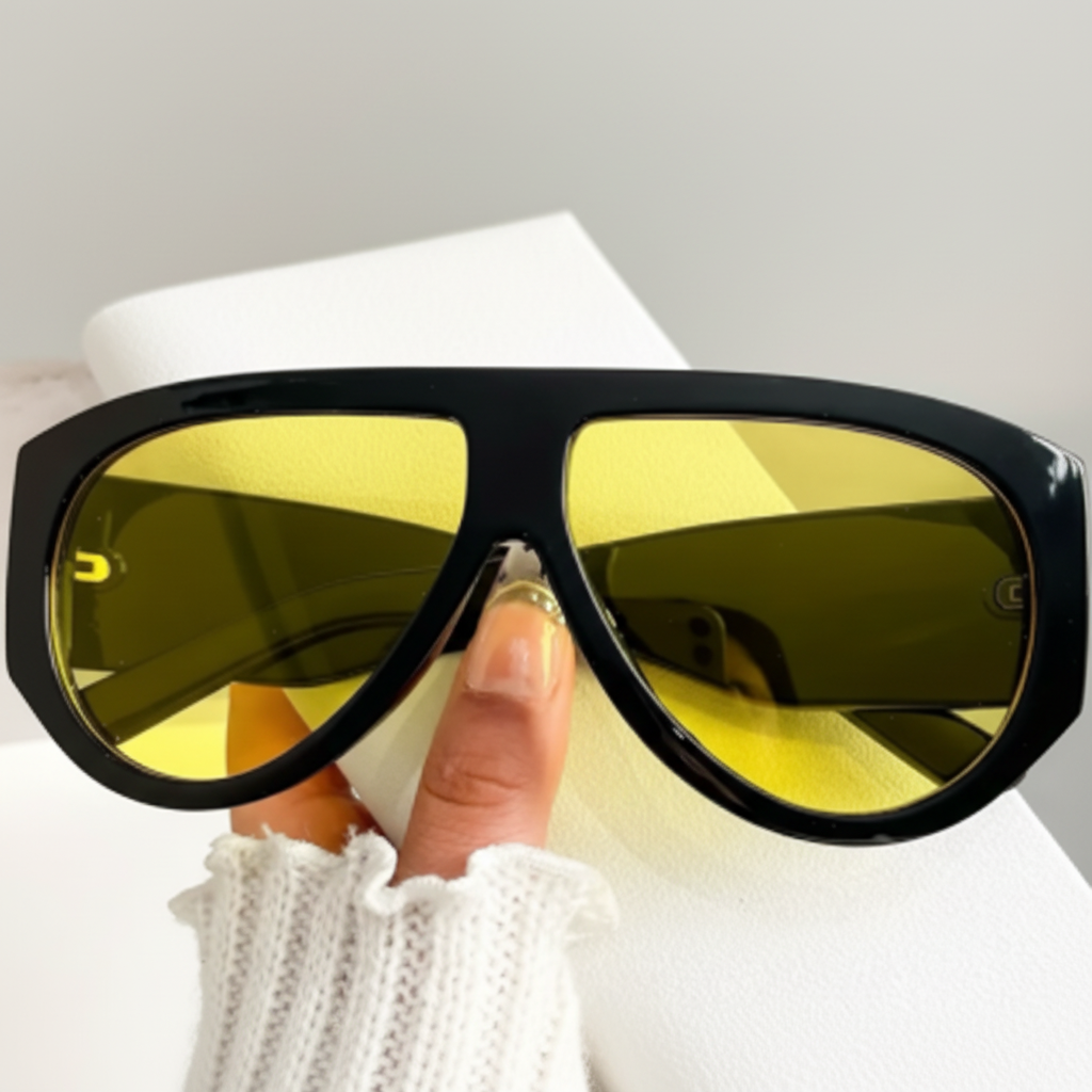 Stylish black sunglasses featuring bold yellow lenses. Perfect for a trendy look.